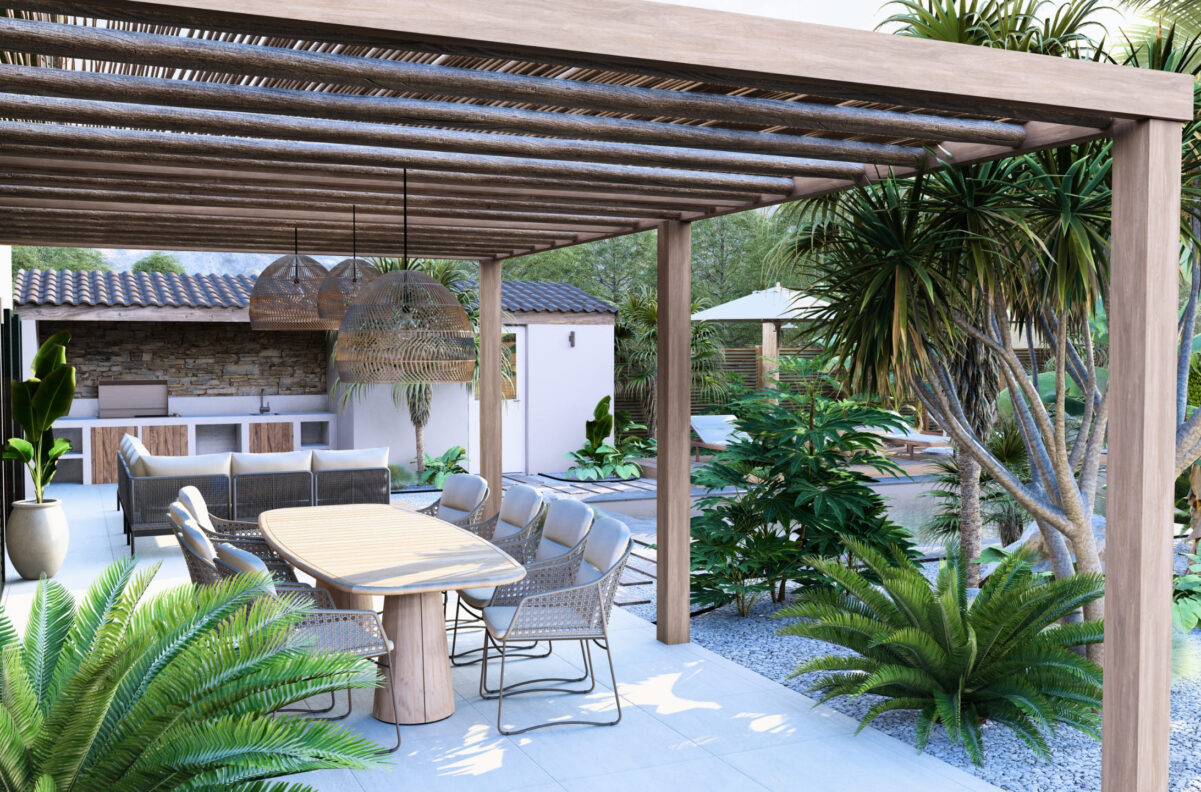 Un mélange de textures riches, de feuillages généreux et de teintes vert profond, associé à du mobilier élégant et des luminaires adaptés, transforme votre jardin en un espace reposant, convivial et immersif, idéal pour profiter pleinement de chaque instant en plein air.